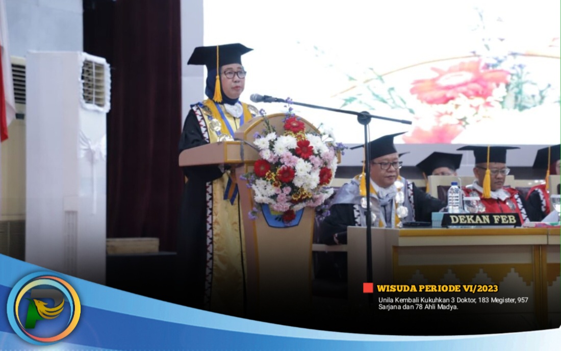 Prof. Lusmeilia memaparkan beberapa capaian Unila  hingga wisuda periode VI tahun akademik 2022/2023, di antaranya, Unila menempati peringkat sembilan berdasarkan SCImago Institution Rankings tahun 2023, juara 1 Lomba Lagu Daerah dalam ajang Lampung Begawi 2023, juara 1 Matematika Jenius Science Competition tingkat nasional, dan medali emas kejuaraan taekwondo ATF UI Championship 2023 tingkat nasional.